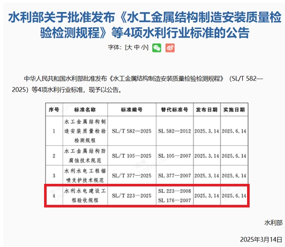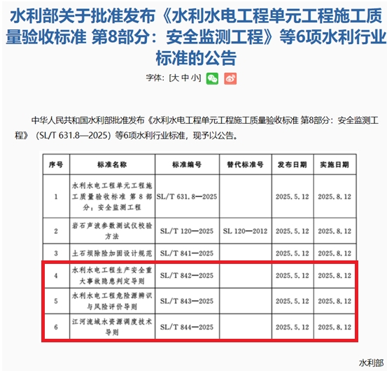 近期,水利部發(fā)布2025年第9號、第11號公告,由公司主編的《水利水電建設(shè)工程驗(yàn)收規(guī)程》(SL/T 223—2025)、《水利水電工程危險(xiǎn)源辨識與風(fēng)險(xiǎn)評價(jià)導(dǎo)則》(SL/T 843—2025)和參編的《水利水電工程生產(chǎn)安全重大事故隱患判定導(dǎo)則》(SL/T 842—2025)、《江河流域水資源調(diào)度技術(shù)導(dǎo)則》(SL/T 844—2025)等4項(xiàng)水利行業(yè)標(biāo)準(zhǔn)獲批準(zhǔn)發(fā)布,將分別于2025年6月14日和8月12日起實(shí)施。