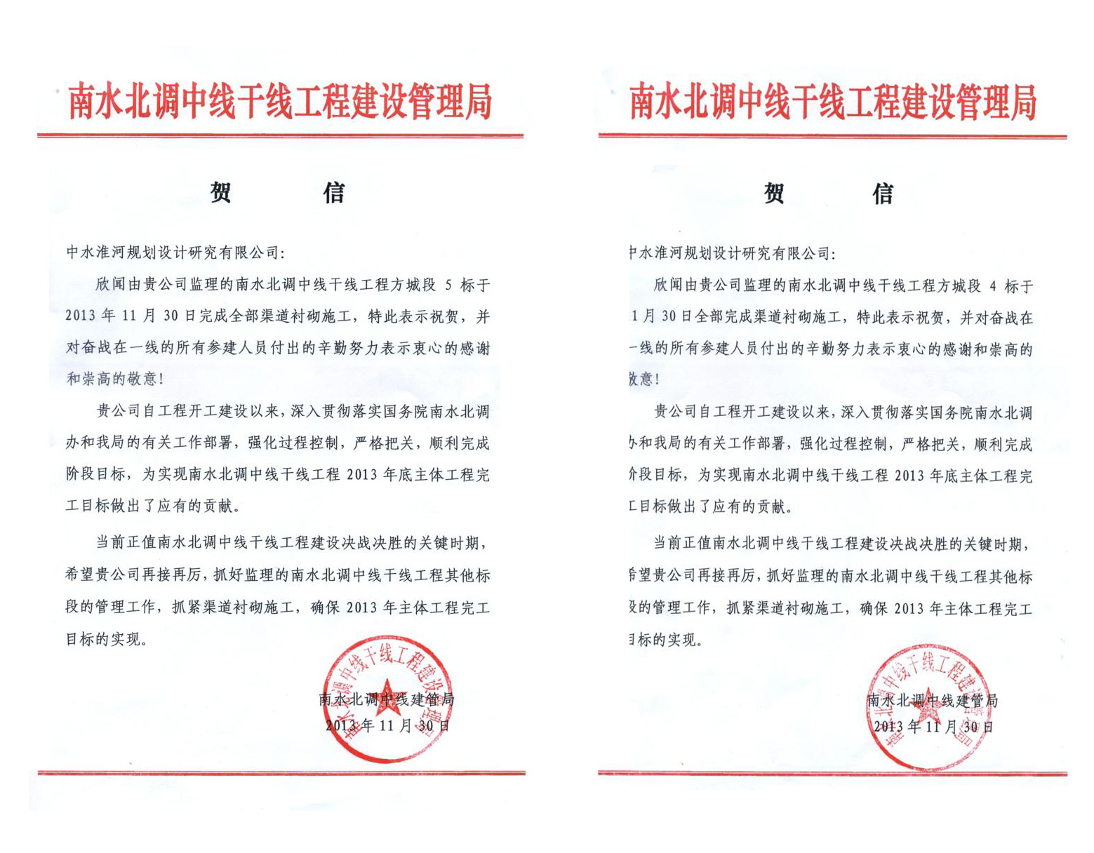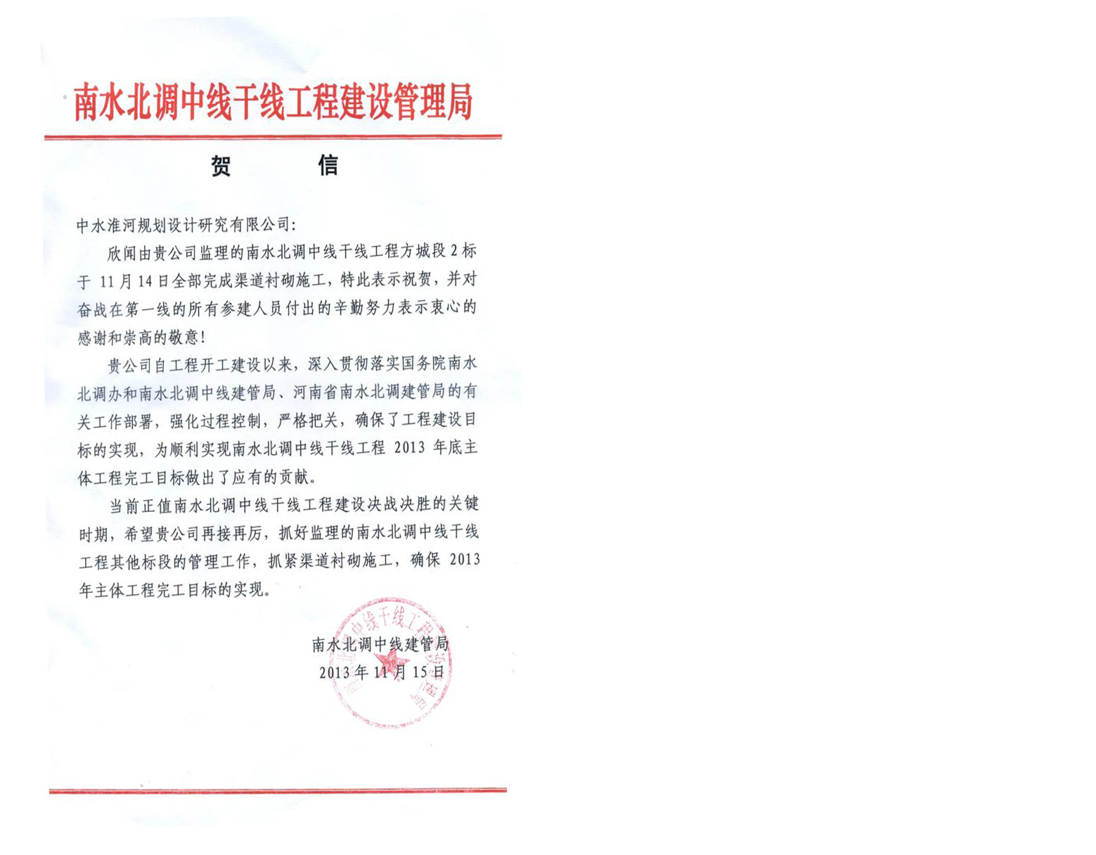 近期,由我公司監(jiān)理的北調(diào)中線干線工程方城段2標(biāo)于11月18日完成全部渠道襯砌施工,4標(biāo)、5標(biāo)于2013年11月30日完成全部渠道襯砌施工。自工程開工建設(shè)以來,公司按照合同和規(guī)程規(guī)的要求,范強(qiáng)化過程控制,嚴(yán)格把關(guān),順利完成階段目標(biāo),為實(shí)現(xiàn)南水北調(diào)中線干線工程2013年底主體工程完工目標(biāo)作出了應(yīng)有的貢獻(xiàn)。為此,南水北調(diào)中線干線工程建設(shè)管理局特向我公司發(fā)來賀信,賀信全文如下: