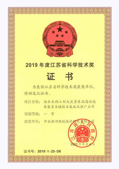 近日,公司合作完成的“南水北調(diào)工程大流量泵站高性能泵裝置關(guān)鍵技術(shù)集成及推廣應(yīng)用”榮獲2019年度江蘇省科學(xué)技術(shù)一等獎(jiǎng)。