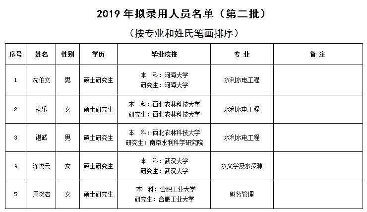根據(jù)公司2019年招聘計(jì)劃,經(jīng)過資格審查、面試、體檢等程序,確定沈伯文等5人為公司第二批擬錄用人員(名單附后)?,F(xiàn)予公示。
